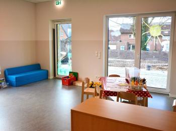 Große Flure bieten zusätzlich Raum zur Verstärkung des aktiven Spiel- und Entdeckungstriebes der Kinder. Damit nach Bewegung wie Laufen, Rennen, Klettern, Balancieren, Rutschen und Krabbeln auch entspannt und ausgeruht werden kann, verfügt jeder Gruppenraum über einen Schlaf- bzw. Snoezelraum.